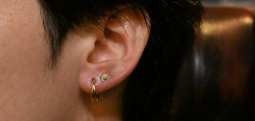 耳たぶにBVLAのジュエリーを二つ並べたお客様をご紹介いたします。